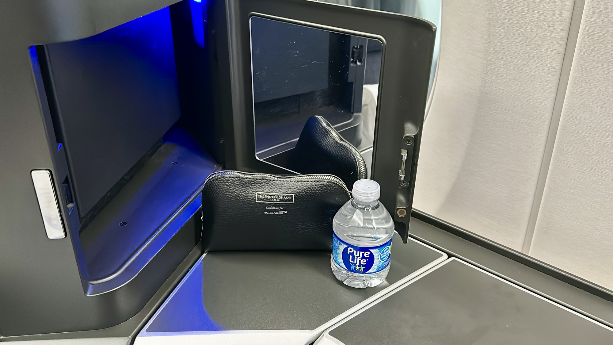 The Business Class Amenities – While British Airways doesn’t provide pajamas or slippers in business class, they do offer a selection of thoughtful amenities. A leather pouch from The White Company London awaited us at our seats, stocked with noise-canceling headphones and bottled water. The bedding and pillow were of good quality, and the addition of a thin mattress pad made the seat a bit more comfortable for sleeping. Although the lavatories weren’t particularly spacious, they were well-maintained, regularly cleaned, and stocked with a selection of toiletries.