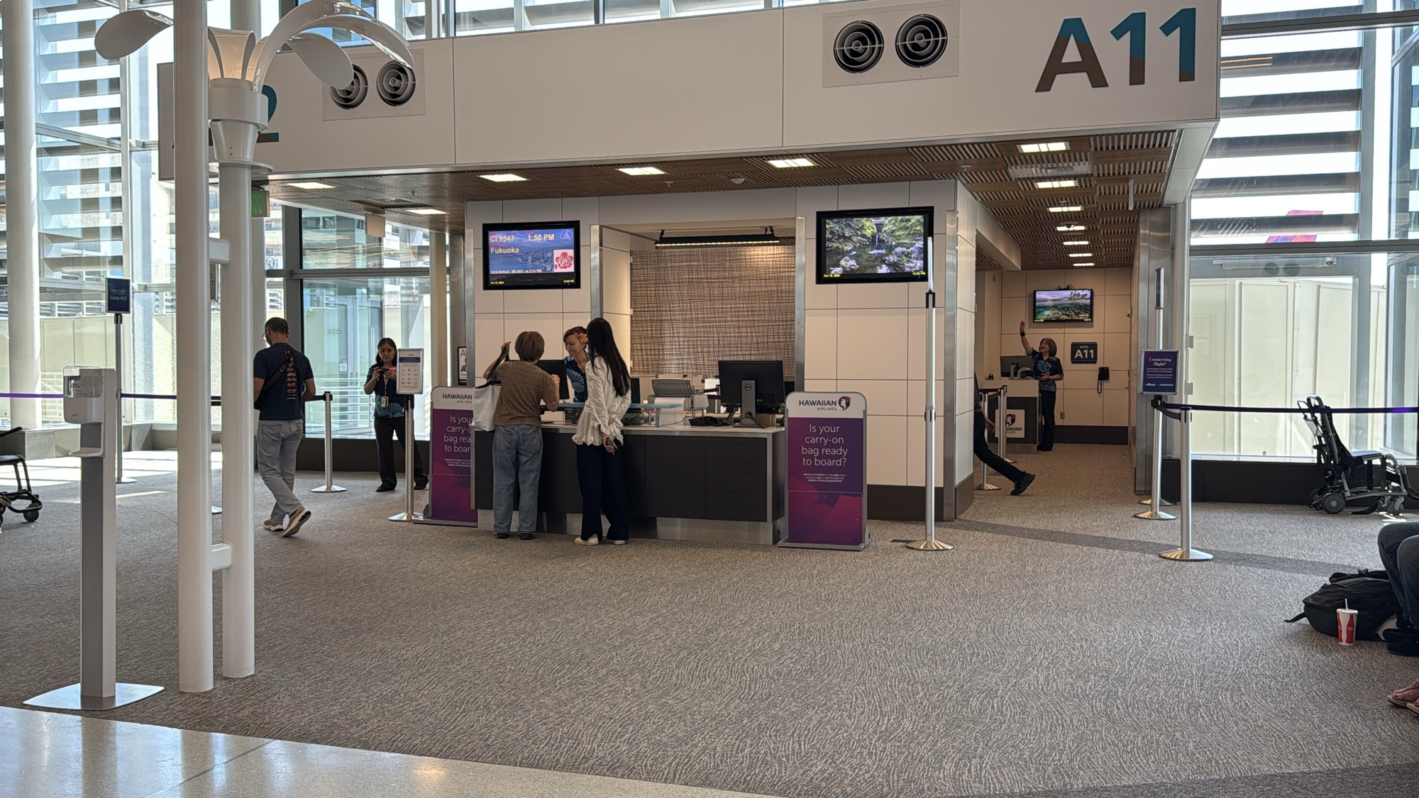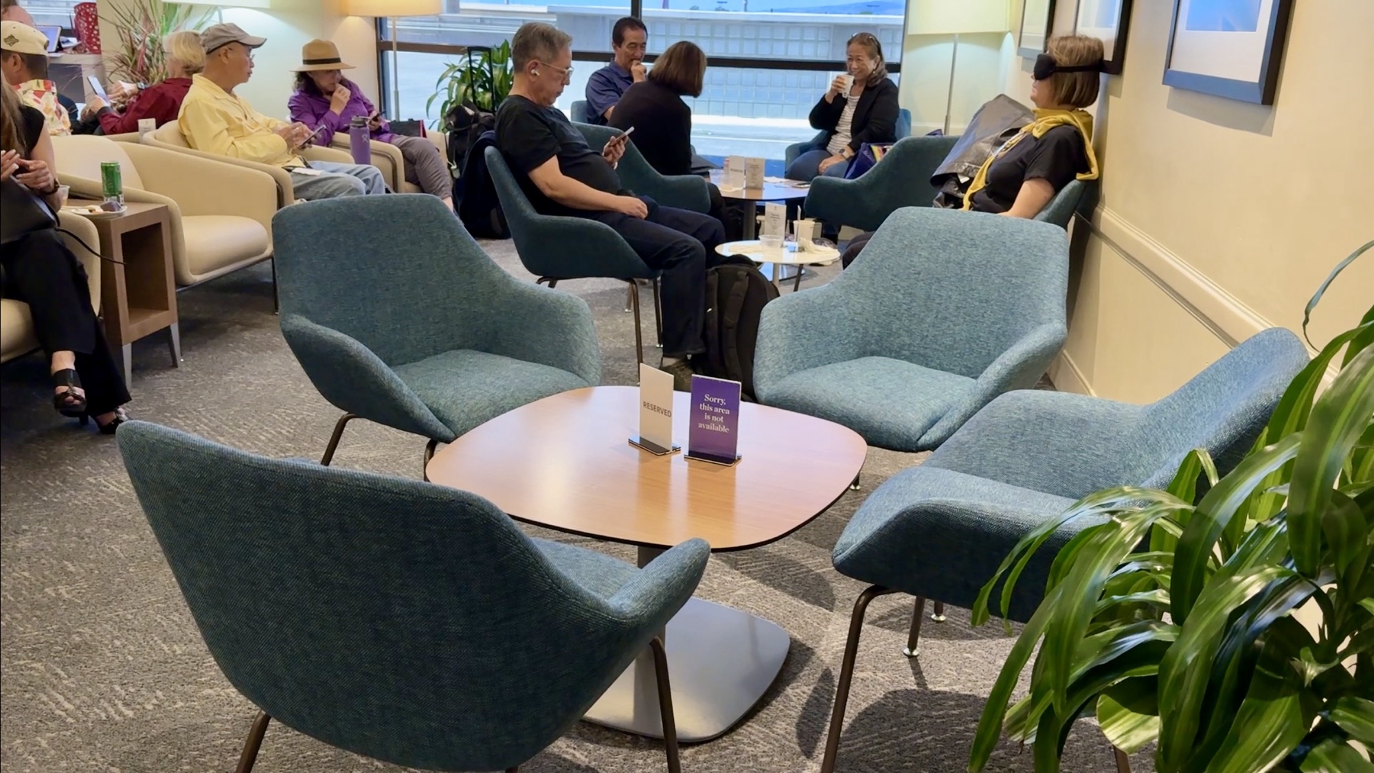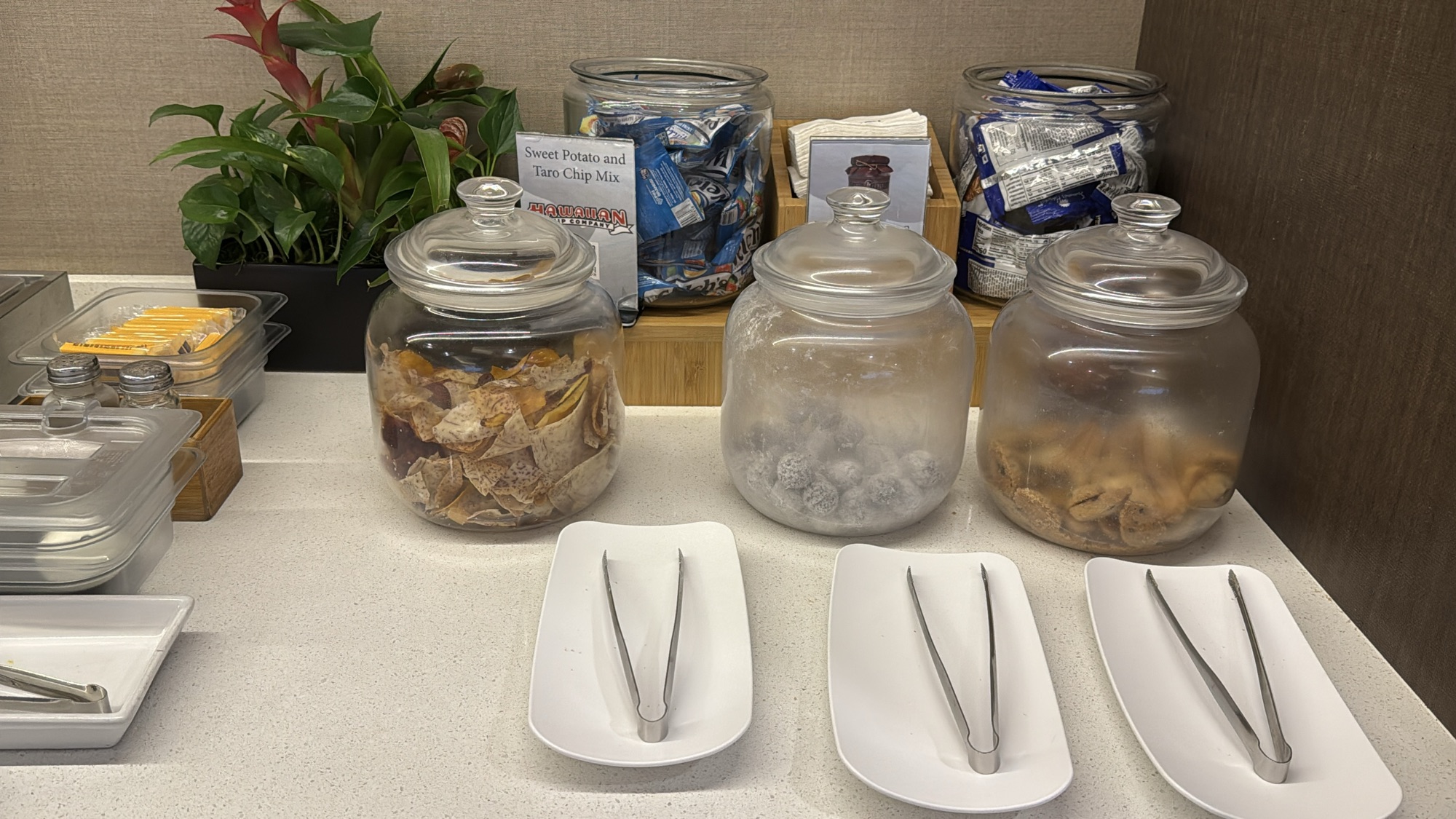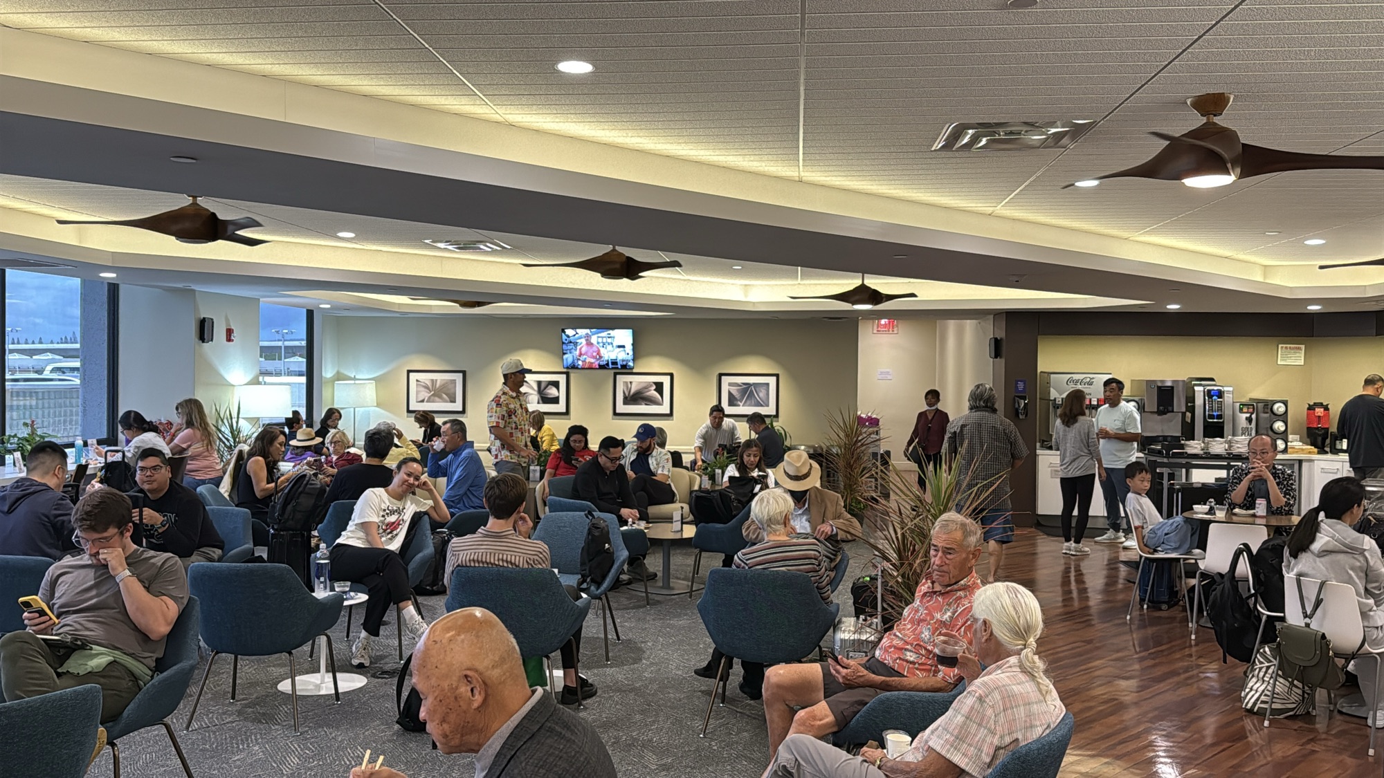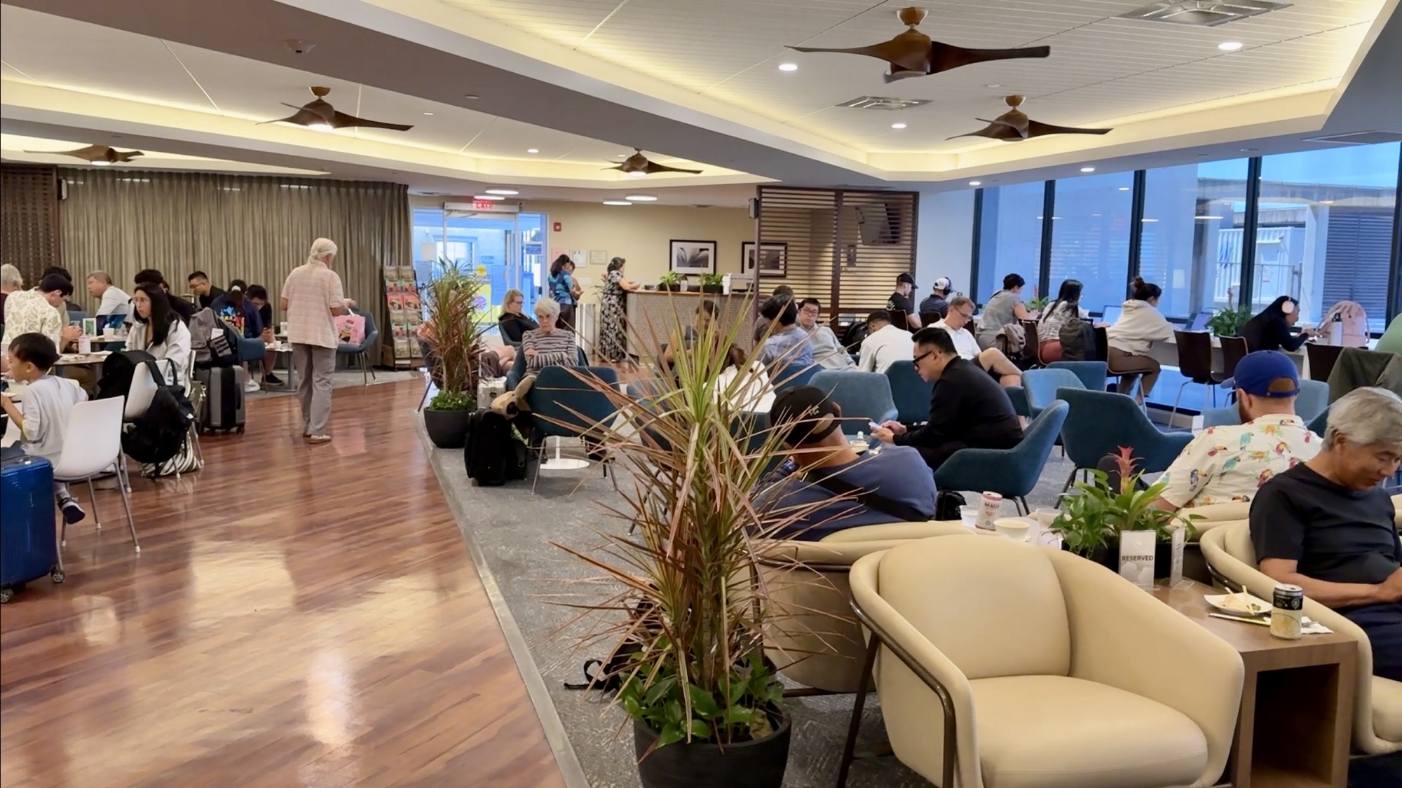 The Plumeria Lounge in Honolulu – Business class passengers on international itineraries gain access to the Plumeria Lounge, which is marketed as Hawaiian Airlines’ flagship lounge. Unfortunately, the lounge is quite small, with limited seating that quickly filled up during our visit, making the space feel cramped. While it offers a selection of hot and cold dishes and beverages, the options were somewhat underwhelming for a lounge of this status.