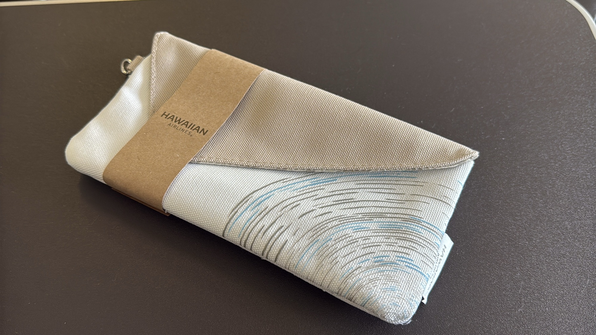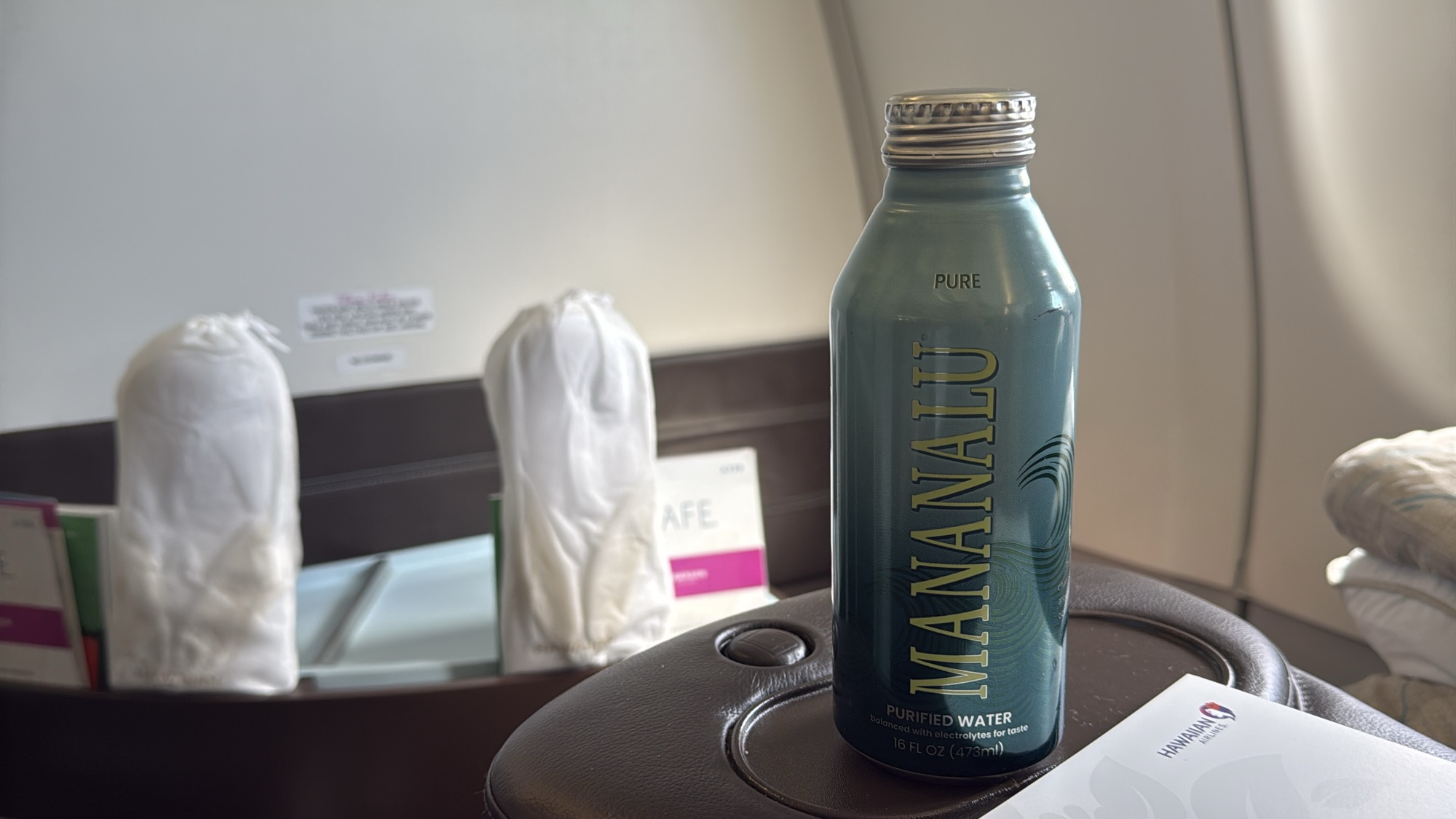 The Amenities – Hawaiian’s business class amenities were thoughtfully curated for comfort and sustainability, even if they weren’t overly lavish. Shortly after boarding, the crew handed out a basic amenity pouch, followed by a basket of additional items from which we could choose exactly what we needed—a sustainable approach that helps reduce waste. For in-flight comfort, Hawaiian provides a bottled water, plush mattress pad (which the crew will set up for you), a full-size pillow, a thick duvet, and slippers, making it easy to settle in for a long journey. The business class lavatories, while compact, were kept spotless and decorated with fresh flowers, adding a touch of charm. They were also stocked with hand lotion and facial mist, small but welcome details that enhanced the overall experience.
