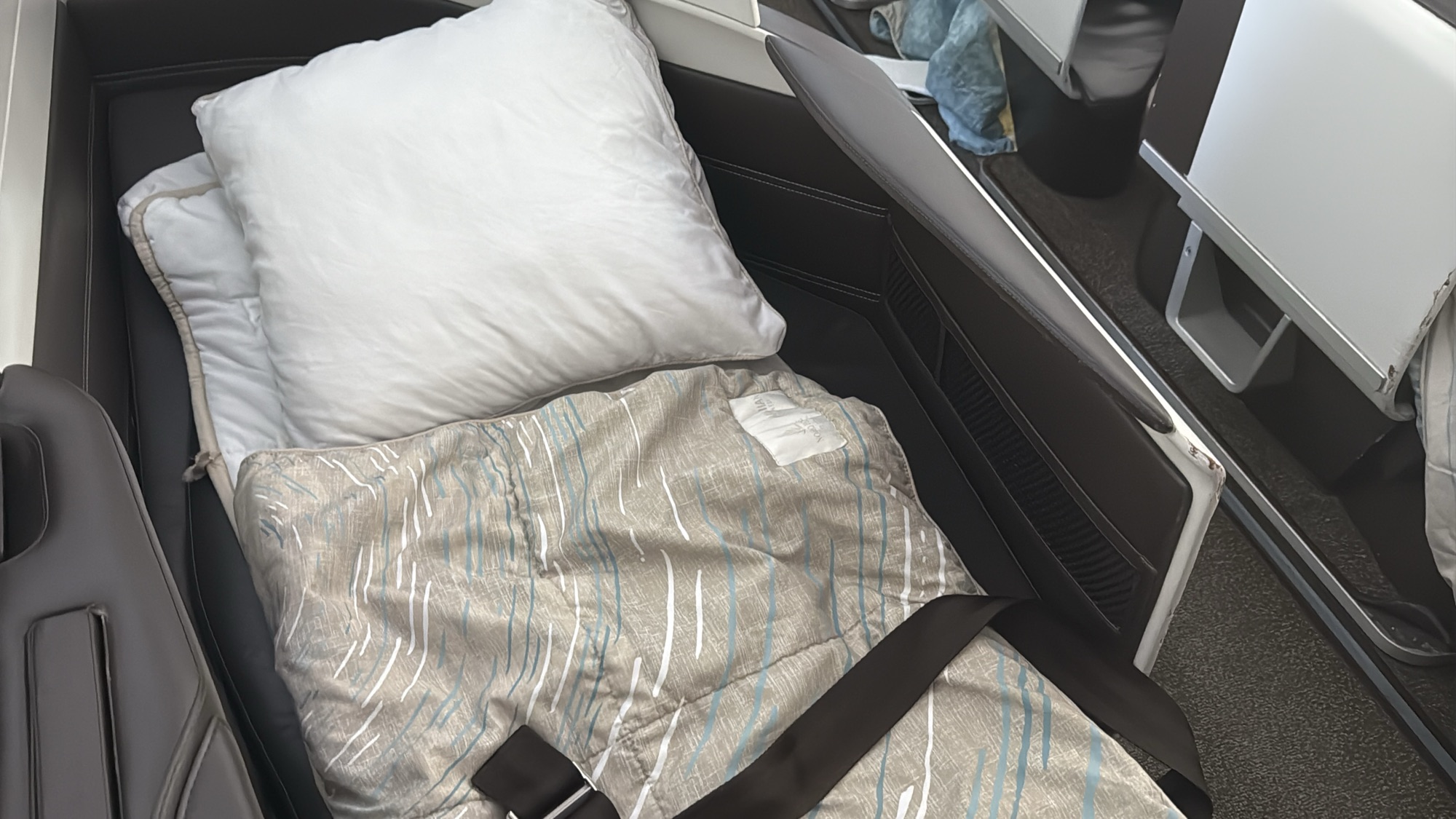 Business Class Seats – My excitement to experience Hawaiian’s business class seats was tempered by a few practical issues. The seats felt cramped and lacked convenient storage space. While they do recline fully flat, privacy is limited—aside from a small retractable partition between seats. Sitting in 1H near the aisle, I found myself disturbed by noise and activity from the galley, and my legs were occasionally bumped by passing crew. My companion in 1J, a bulkhead seat, also had to step over me in bed mode to access the aisle, which could be inconvenient for solo travelers.
