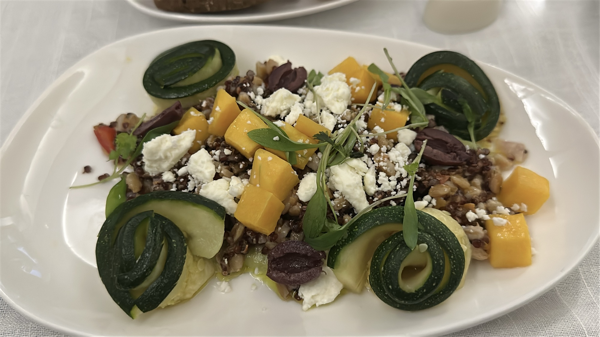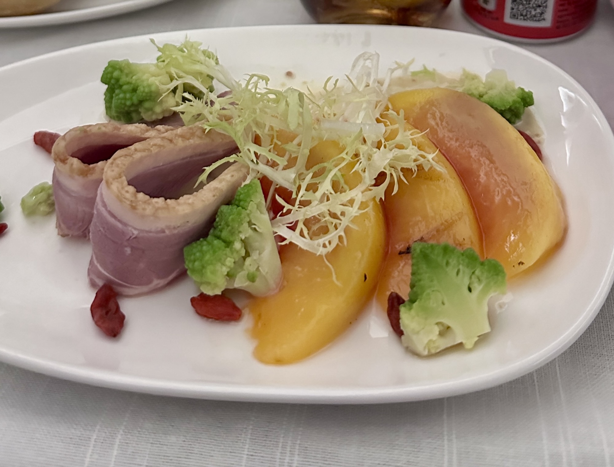 The Catering – As a fan of Spanish cuisine (a major reason we love visiting Spain), I was eager to experience Iberia’s Spanish-inspired catering. Iberia also features an impressive list of Spanish wines, which is a thoughtful touch. After takeoff, the meal service started with a beverage service, accompanied with a few appetizers. For the starter, I opted for the barley and quinoa salad with vegetables, which was fresh and light. My companion enjoyed the smoked duck salad, which he found flavorful.