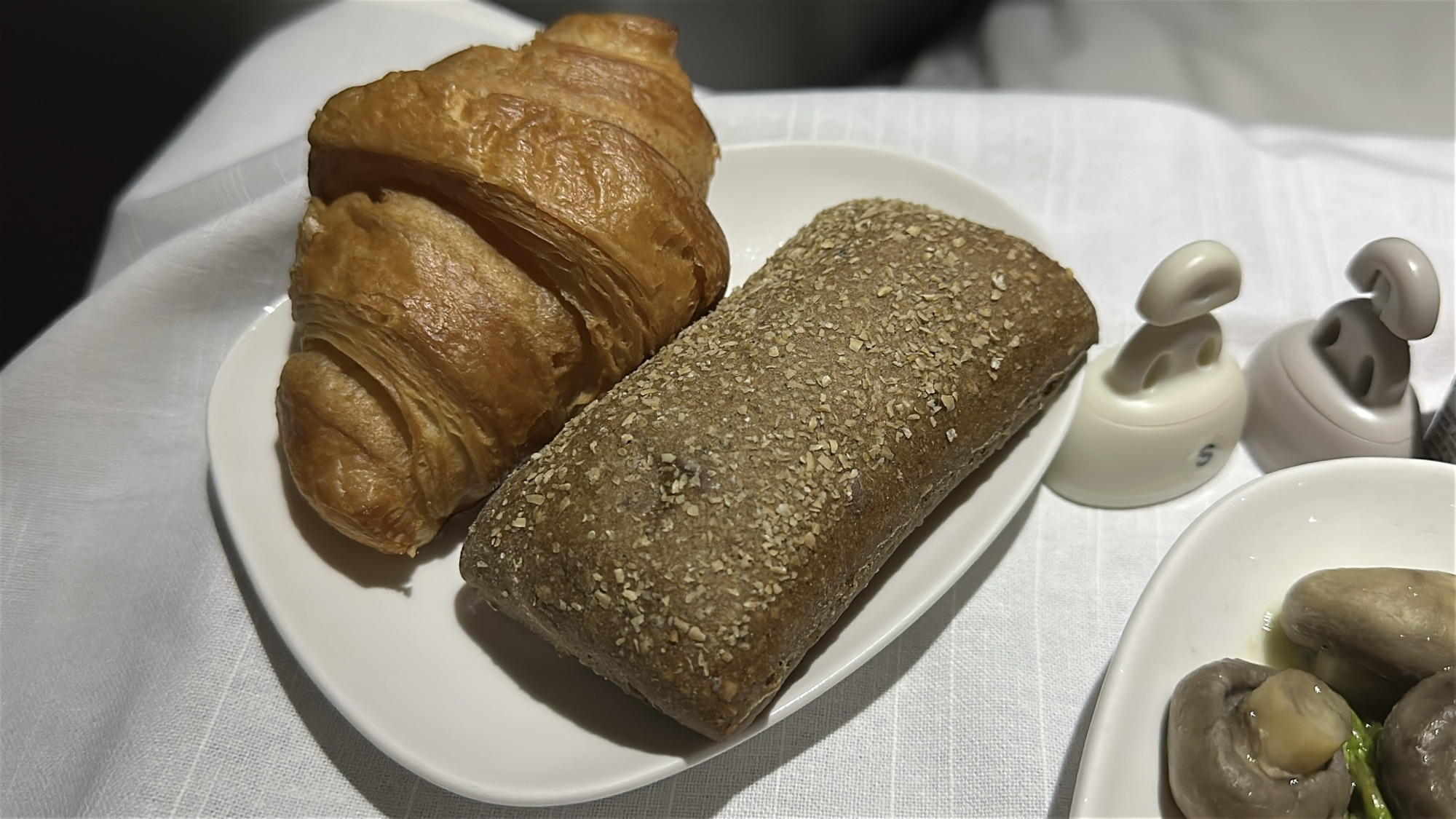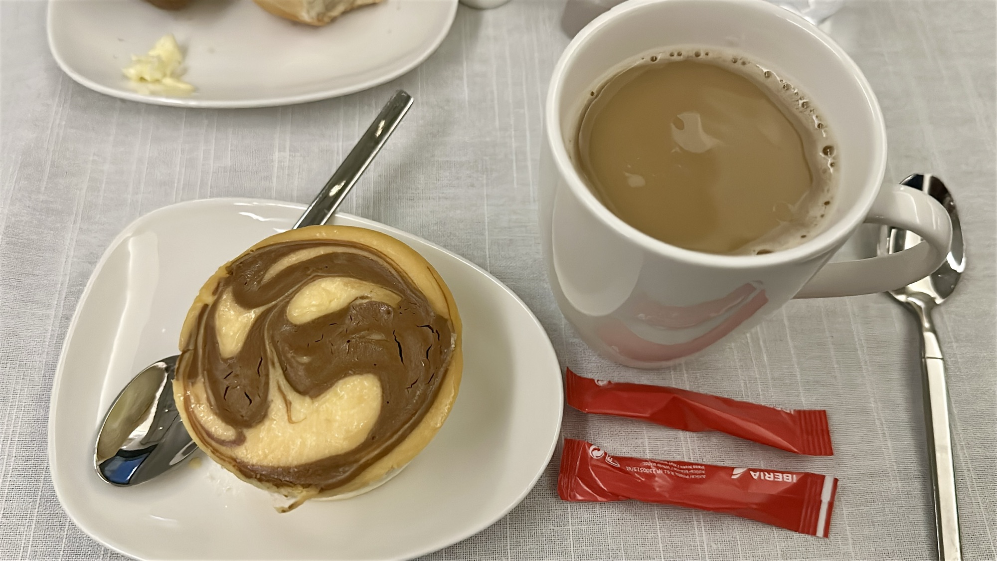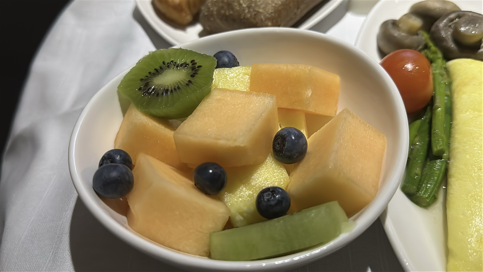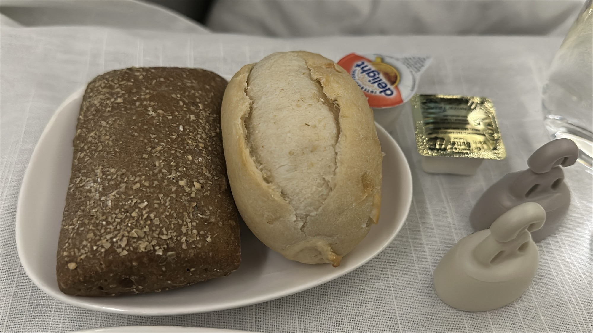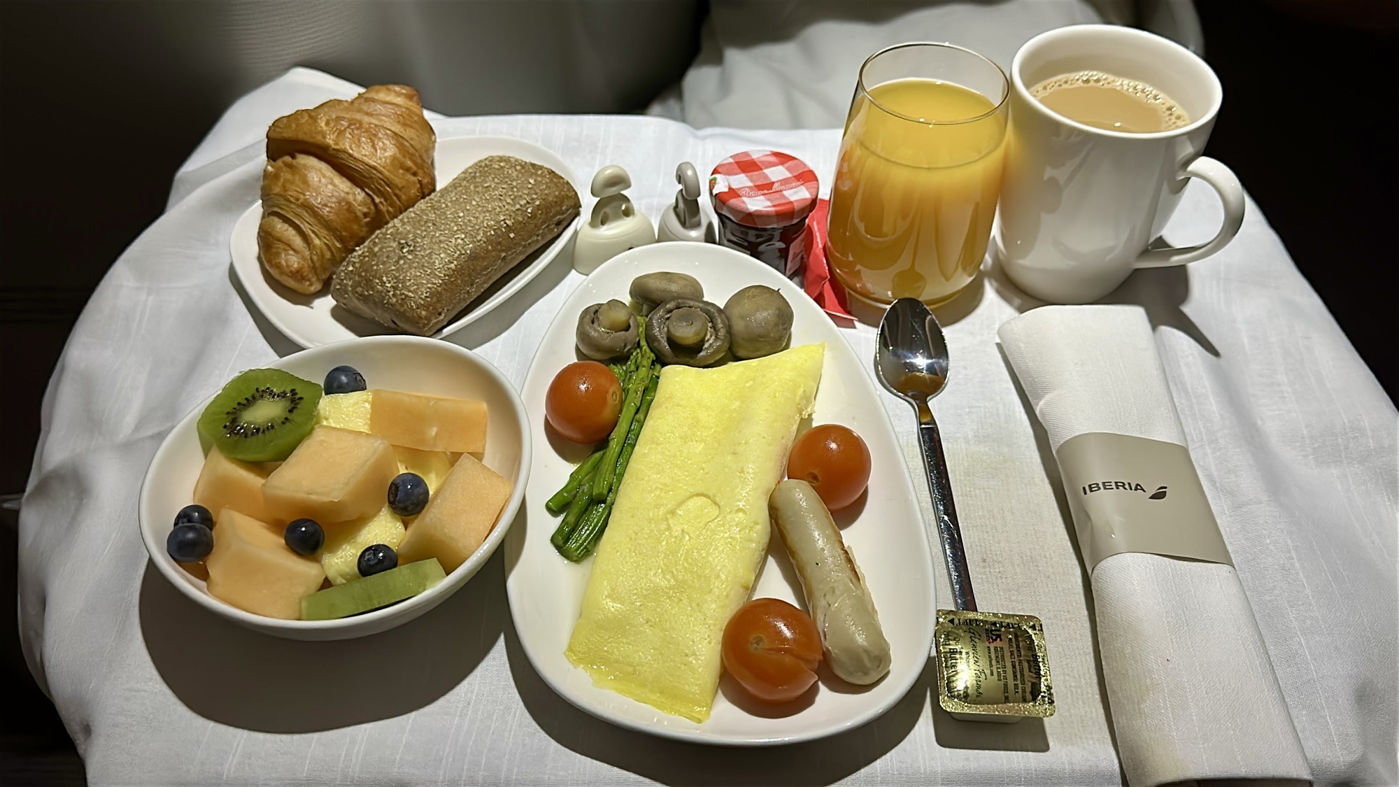 The second meal service was offered 90 minutes before landing. I ordered the omelet, accompanied by sausage, mushrooms, and vegetables, along with fresh fruit and warm bread. While not remarkable, it was satisfying after nine hours in the air. Overall, Iberia’s in-flight dining on this transatlantic route exceeded expectations, offering a solid culinary experience.