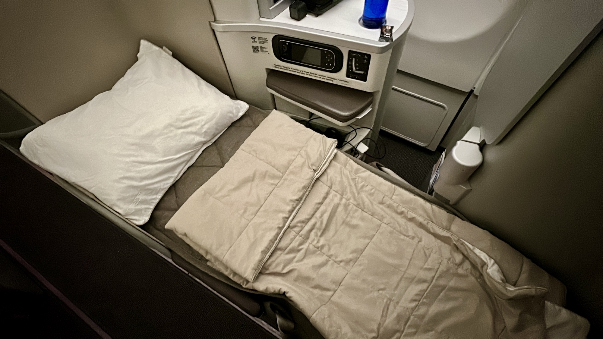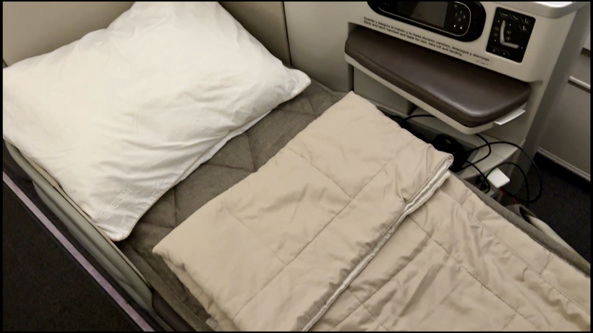 Onboard Amenities – Each business class passenger received a standard amenity kit and noise-canceling headphones, along with a full-size pillow, duvet, mattress pad, and bottled water already waiting at our seats upon boarding—thoughtful touches for added comfort. The lavatories were kept very clean, though they offered only hand soap, with no additional toiletries provided.