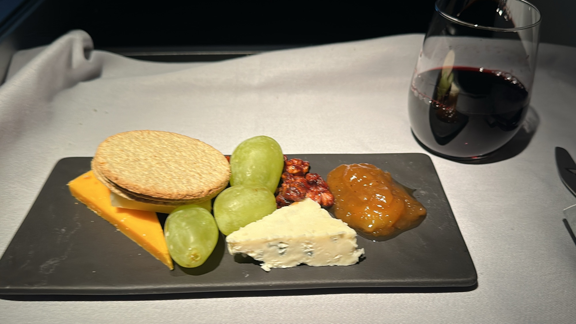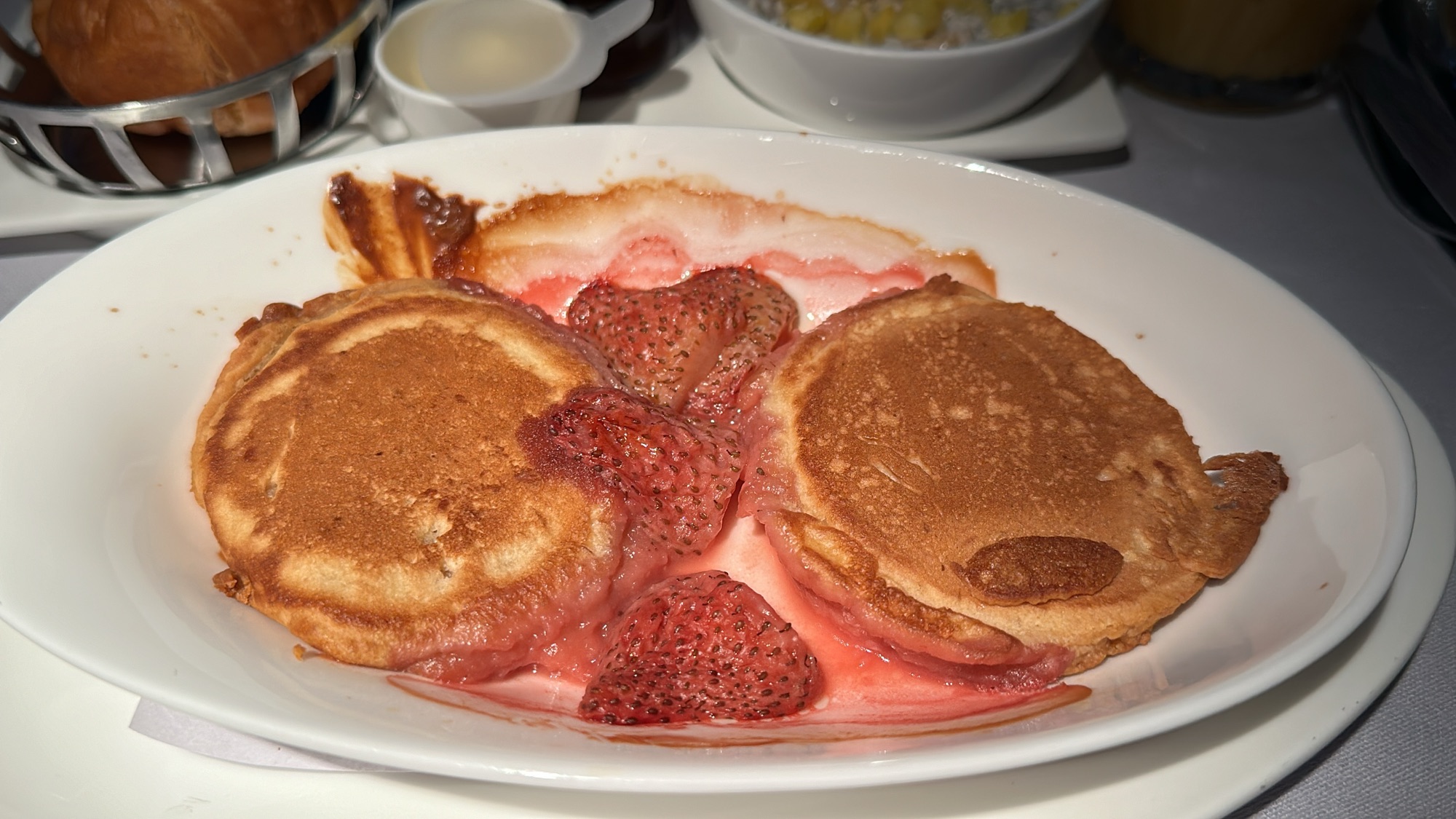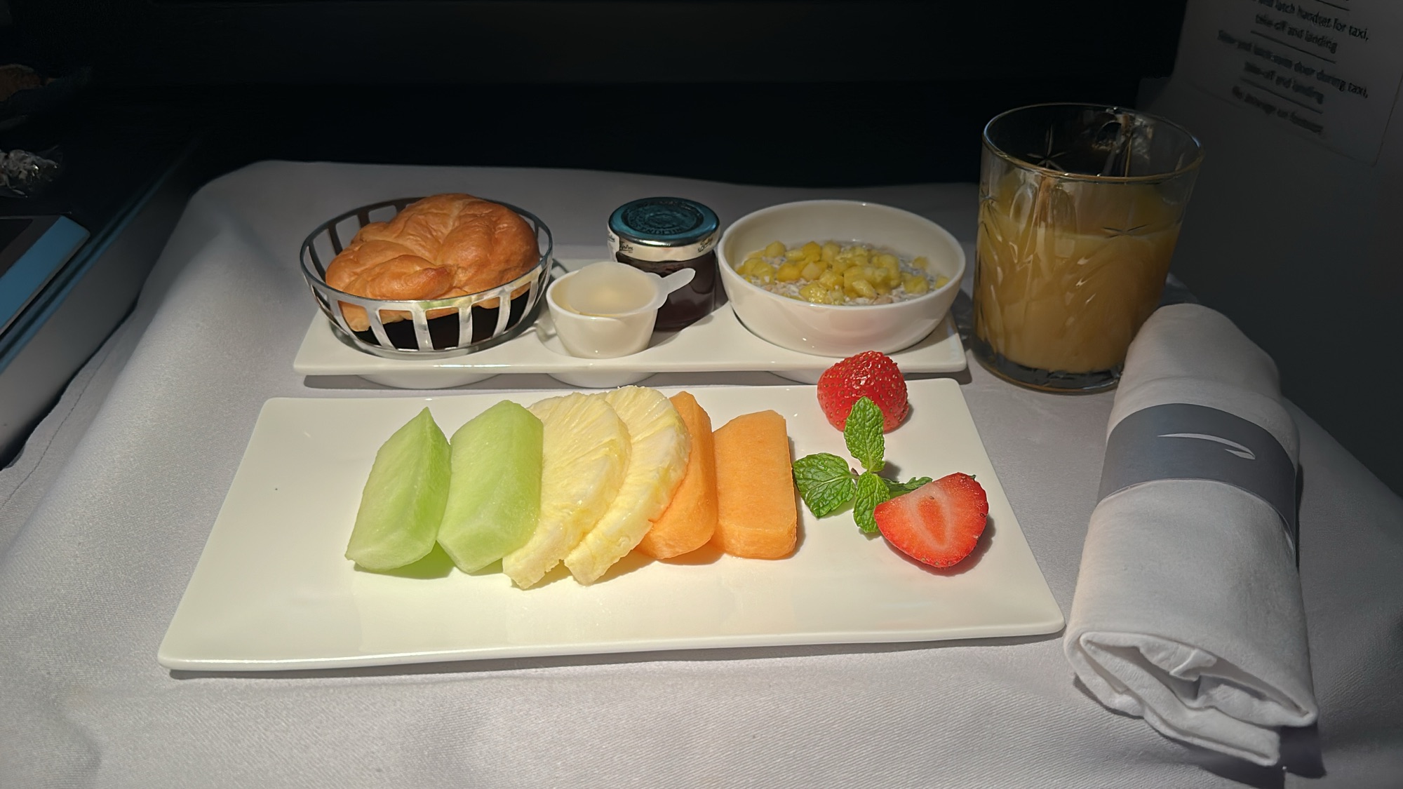 While there was no formal mid-flight meal service, the crew set up the Club Kitchen snack bar near the galley, offering a variety of quick bites for those feeling peckish. About 90 minutes before landing, the pre-arrival meal was served. It began with a plate of fresh fruit, followed by my choice of sweet and satisfying pancakes—a “carbolicious” treat to round out the flight.