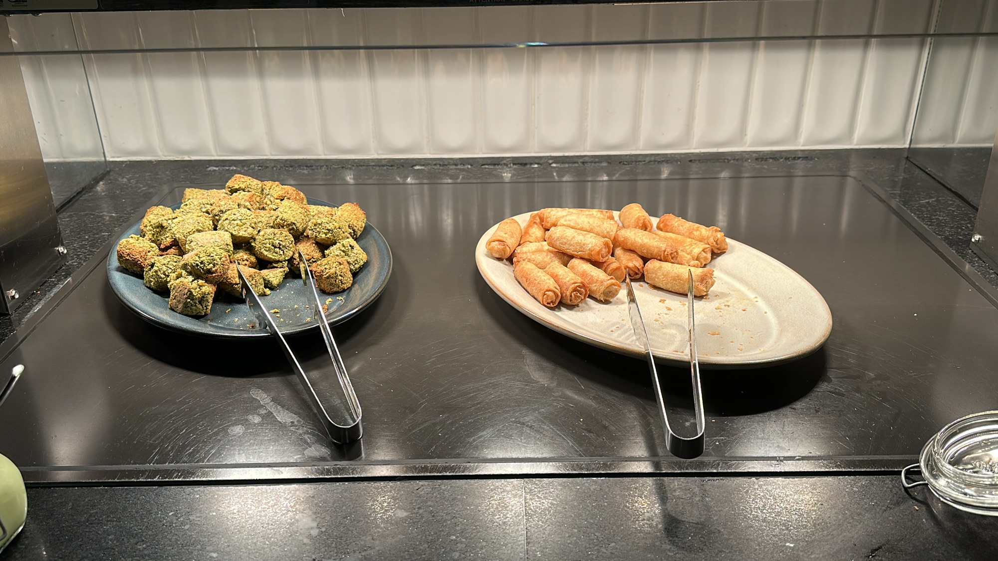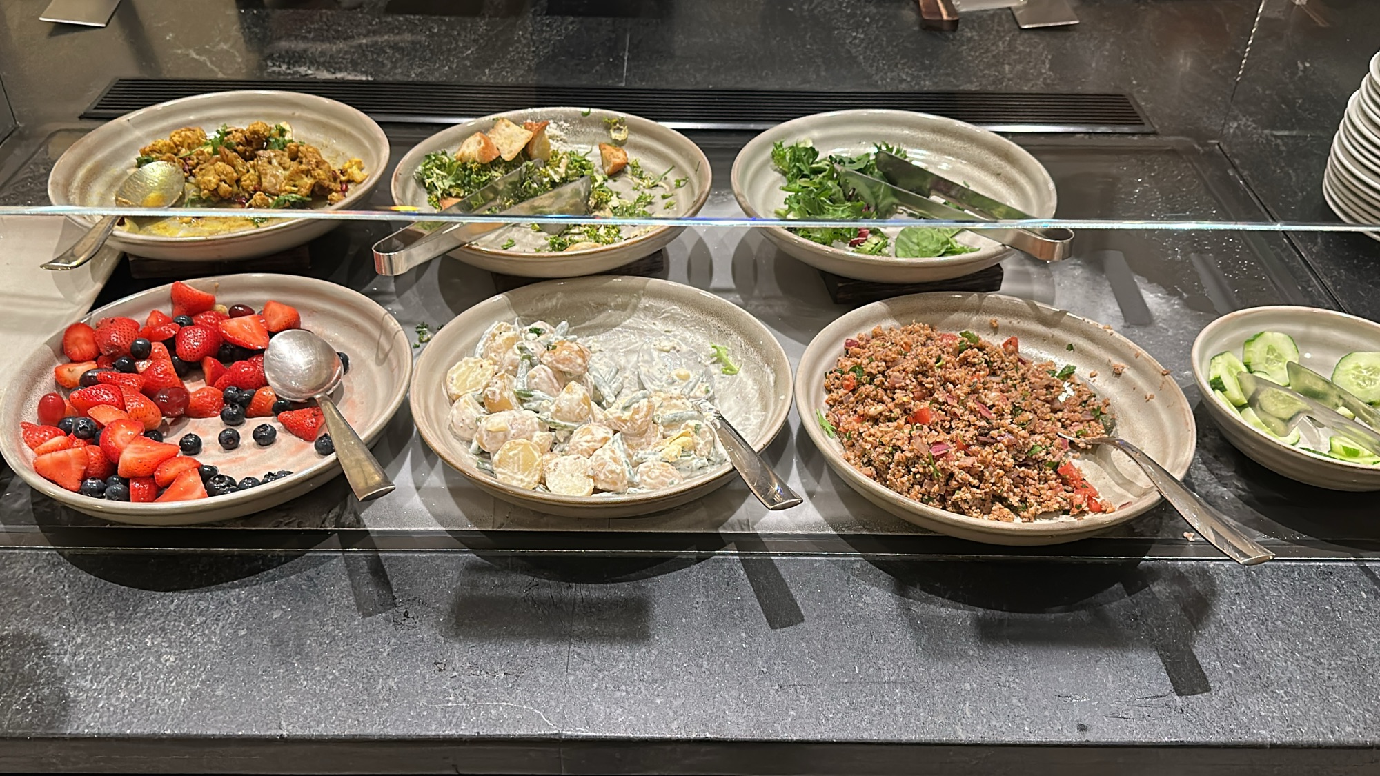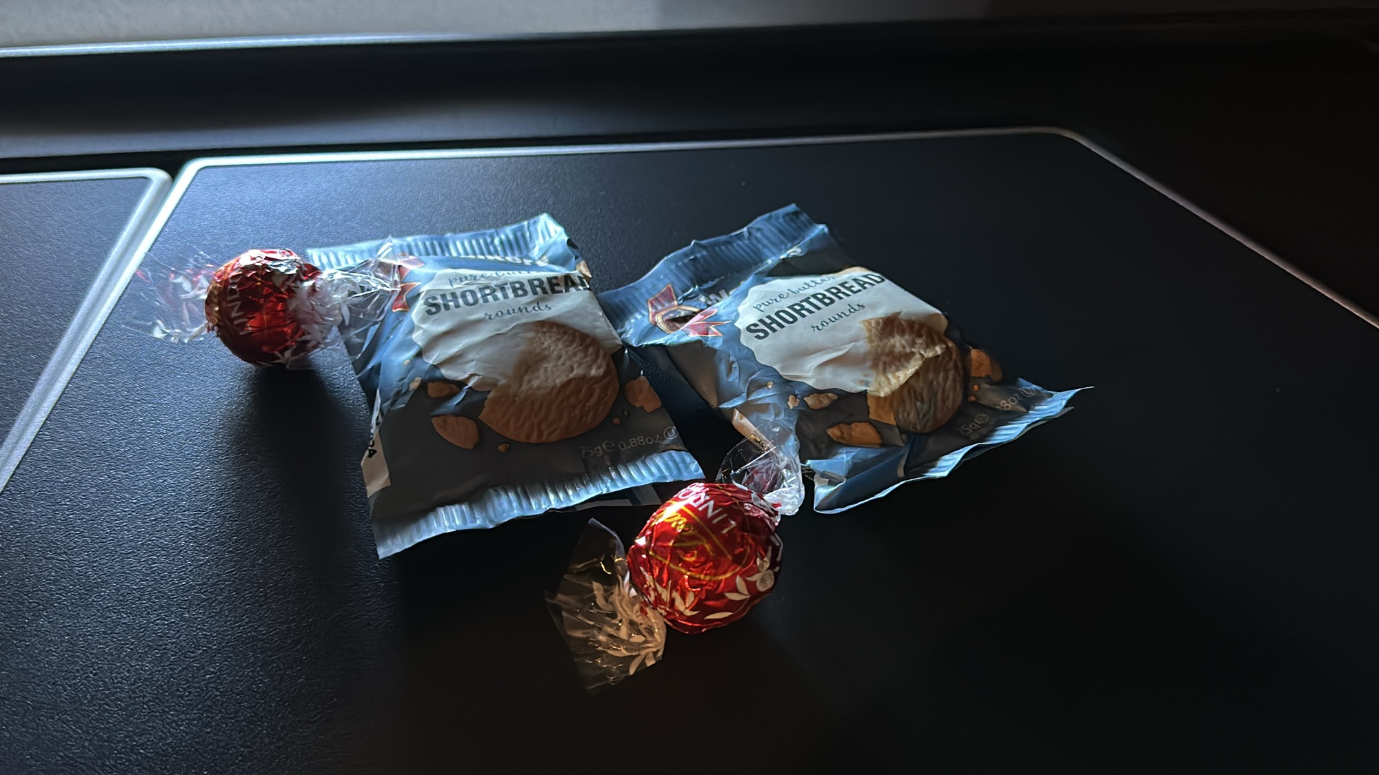 While there was no formal mid-flight meal service, the crew set up the Club Kitchen snack bar near the galley, offering a variety of quick bites for those feeling peckish. About 90 minutes before landing, the pre-arrival meal was served. It began with a plate of fresh fruit, followed by my choice of sweet and satisfying pancakes—a “carbolicious” treat to round out the flight.