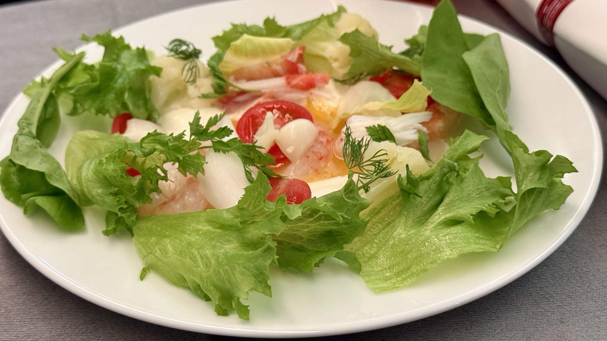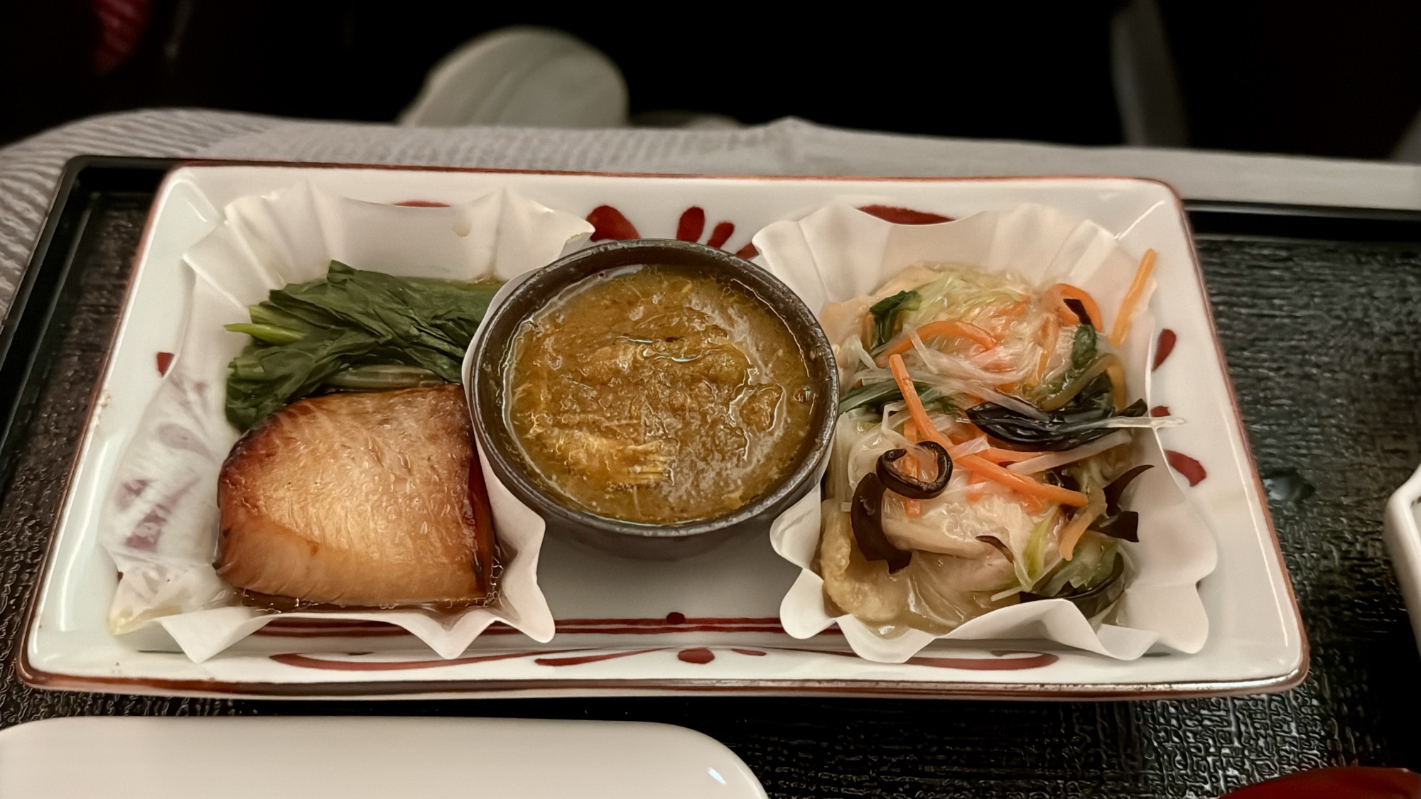 The post-takeoff meal service kicked off with a beverage accompanied by mixed nuts, Italian breadsticks, and a rich tomato purée. For my meal, I chose the Japanese option, starting with a beautifully arranged bento of seasonal appetizers, or “Irodori Gozen.” My companion selected the Western option, which began with a plate of hors d’oeuvres and warm artisan breads. Both starters were a hit, showcasing fresh, high-quality ingredients.