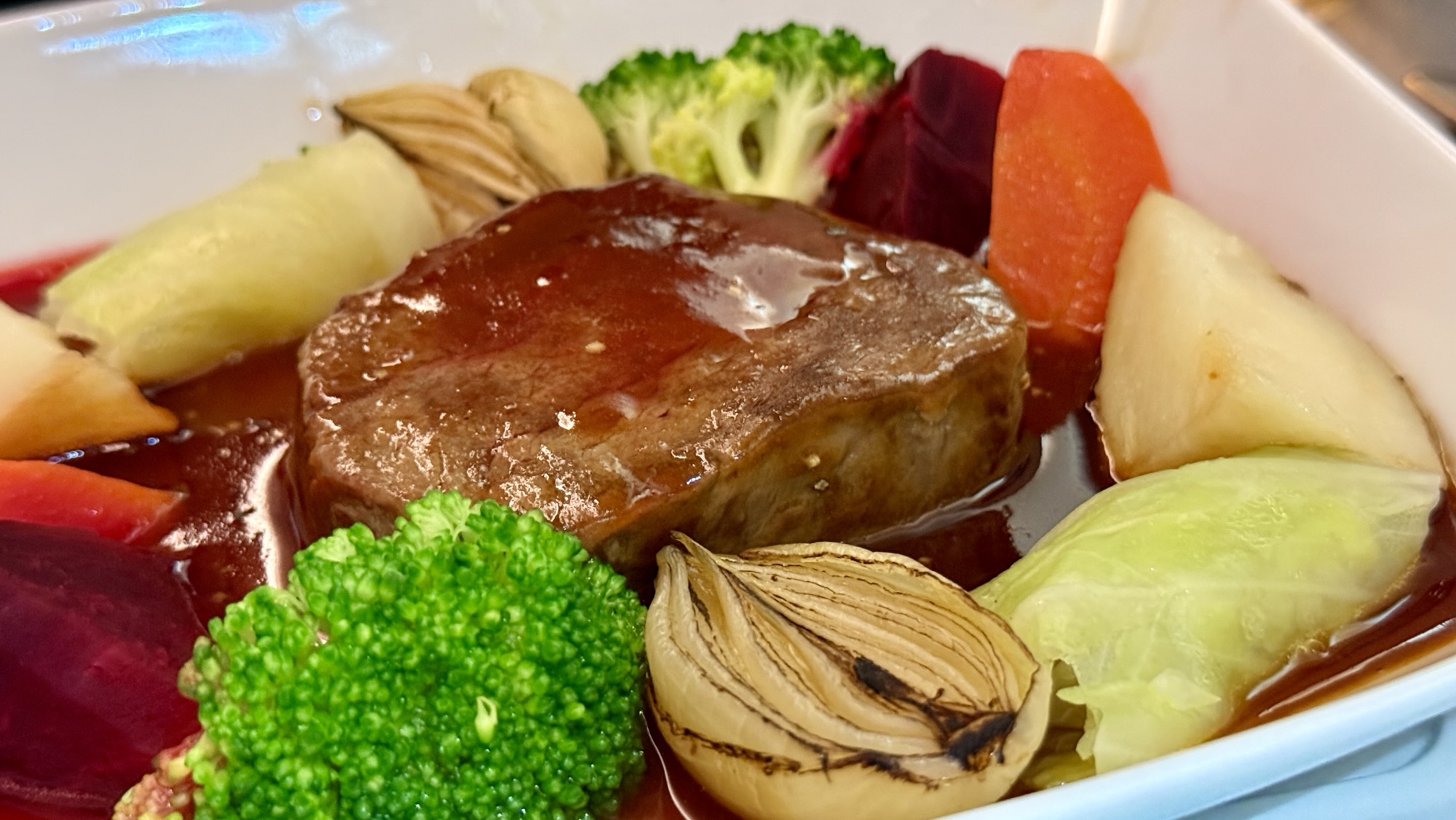 Next came the main courses. My Japanese meal featured grilled marinated cod, deep-fried chicken, and a flavorful Japanese curry sauce, served alongside miso soup, rice, and pickles. It was hearty, satisfying, and packed with flavor. My companion’s Western main—grilled beef filet with demi-glace—was equally impressive, cooked to a perfect medium and bursting with savory richness.