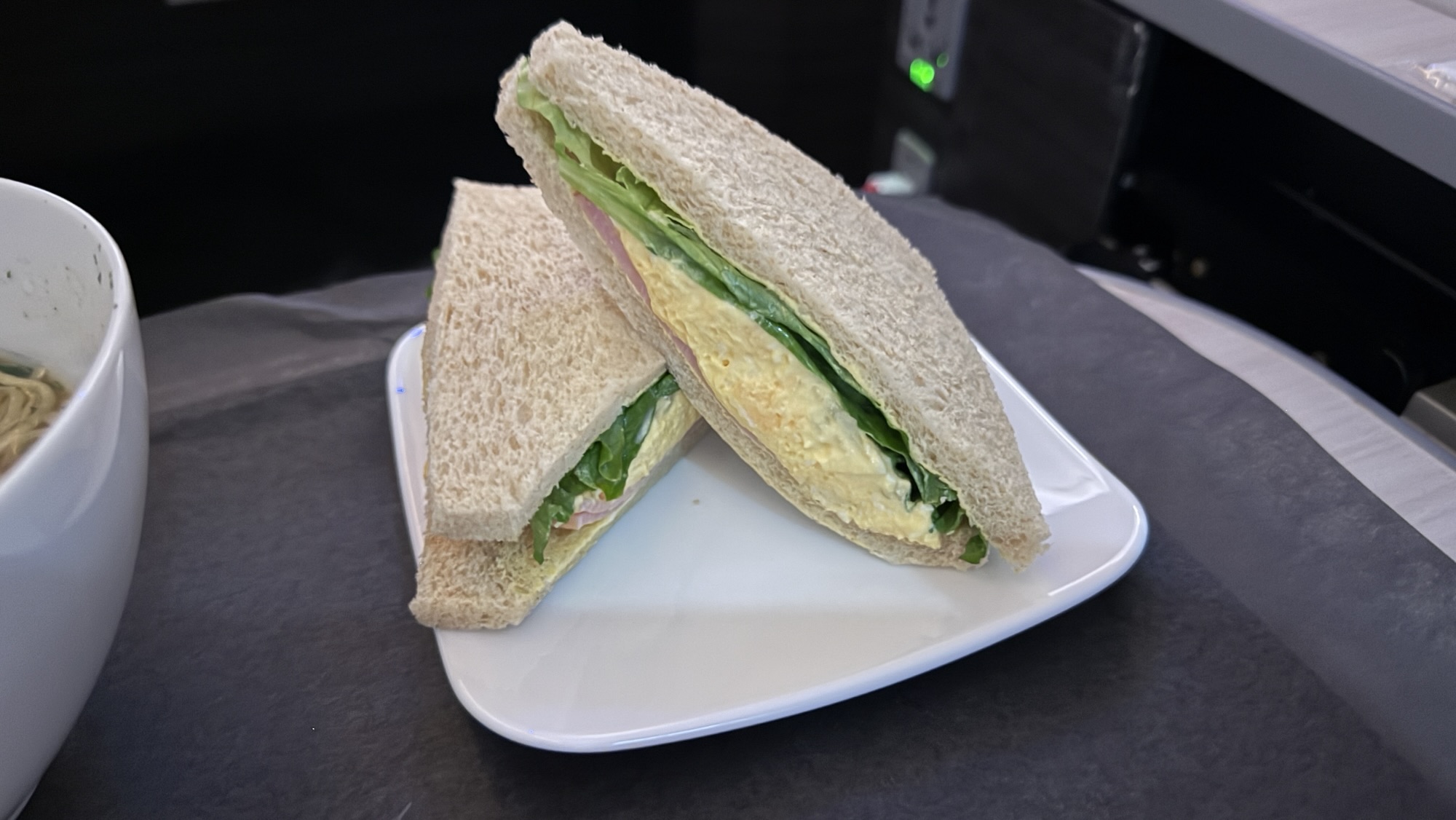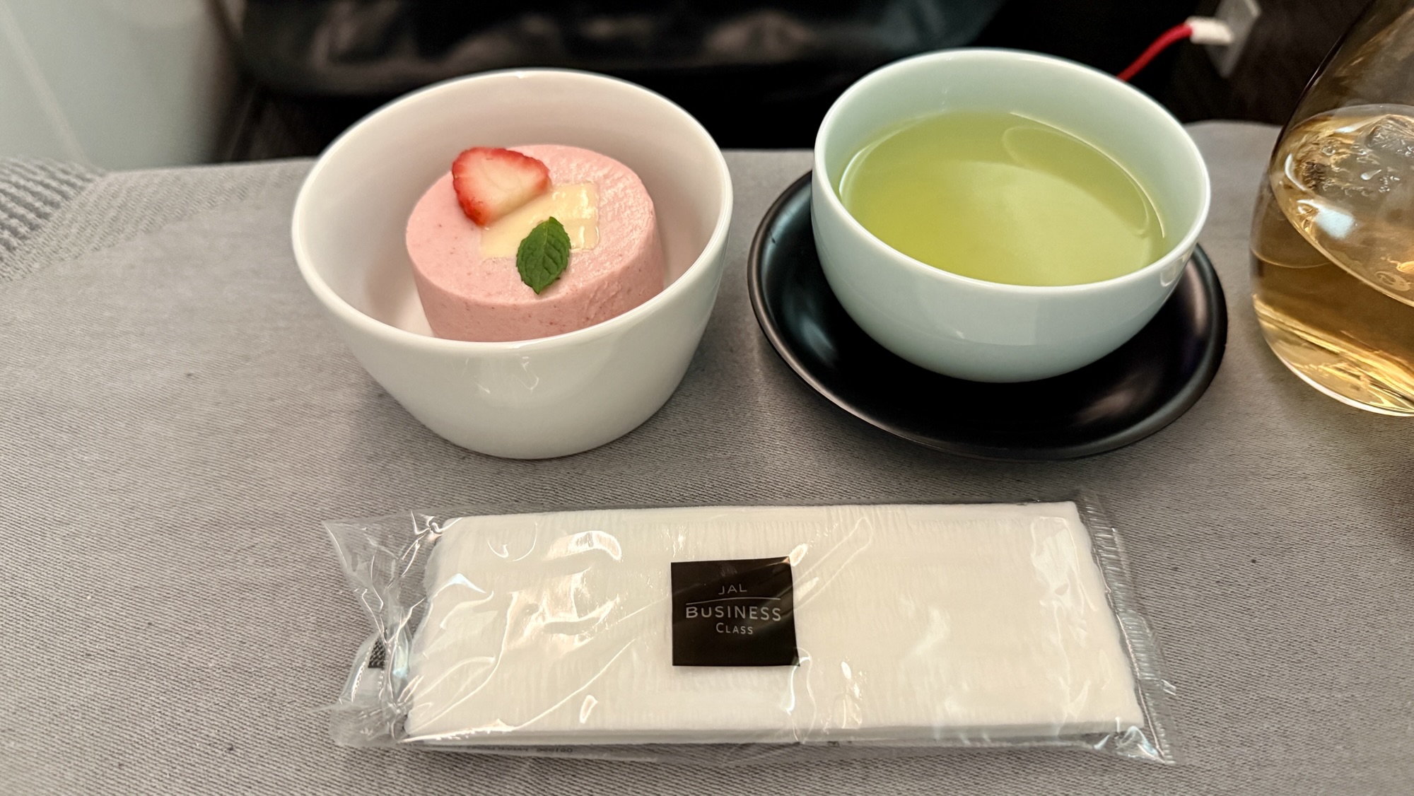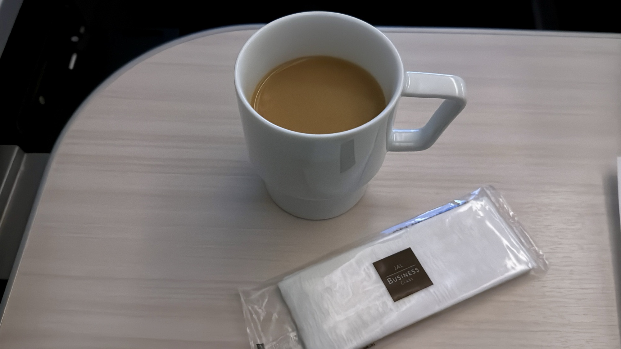 About 90 minutes before landing, we explored the à la carte menu. I opted for the Beef Domannaka Bento and a glass of JAL Skytime, while my companion tried the egg salad sandwich and JAL’s signature yuzu-flavored ramen noodles. Both meals were delicious, providing the perfect conclusion to a memorable in-flight dining experience. The pre-arrival meal finished with a fresh cup of coffee.