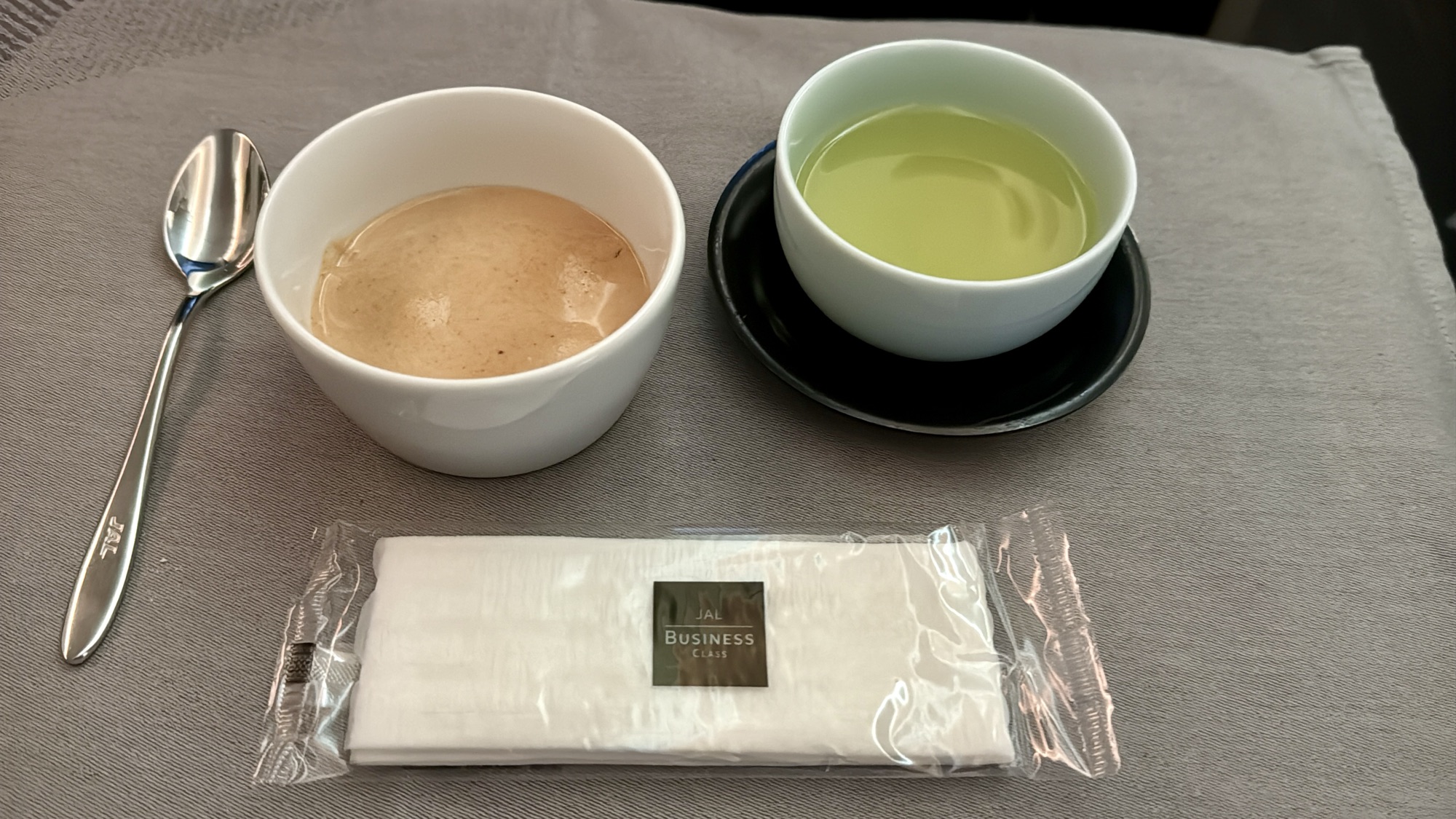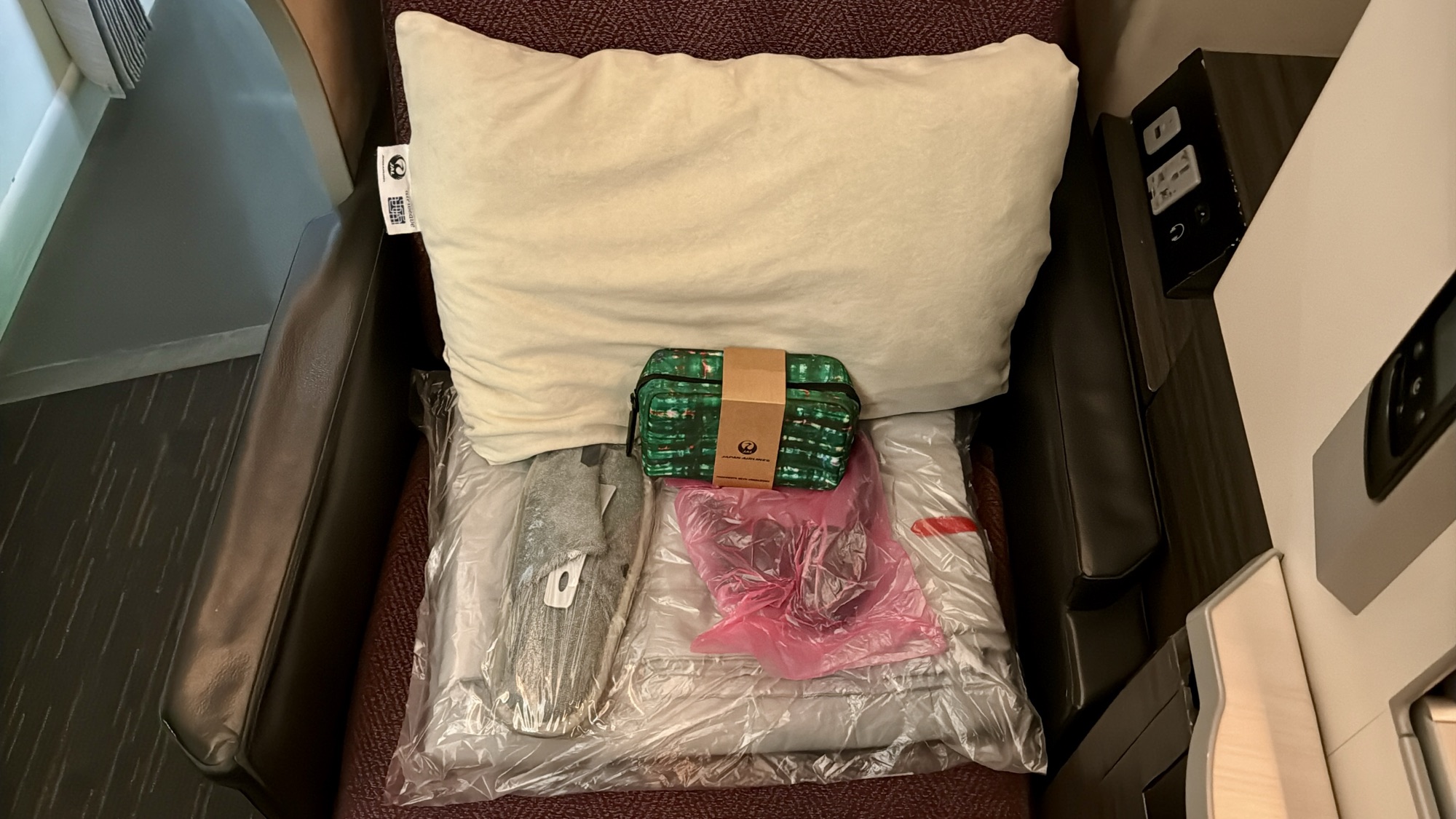 The Amenities – I was impressed with JAL’s new amenity kit, which includes some thoughtful extras like a phone stand and charger, in addition to the usual essentials. While JAL doesn’t provide pajamas in business class, they do offer cozy slippers, a bottled water, and loaner cardigans for added comfort. The airline also provides an Airweave mattress, a full-size pillow, and a duvet, which make for a great sleep experience.