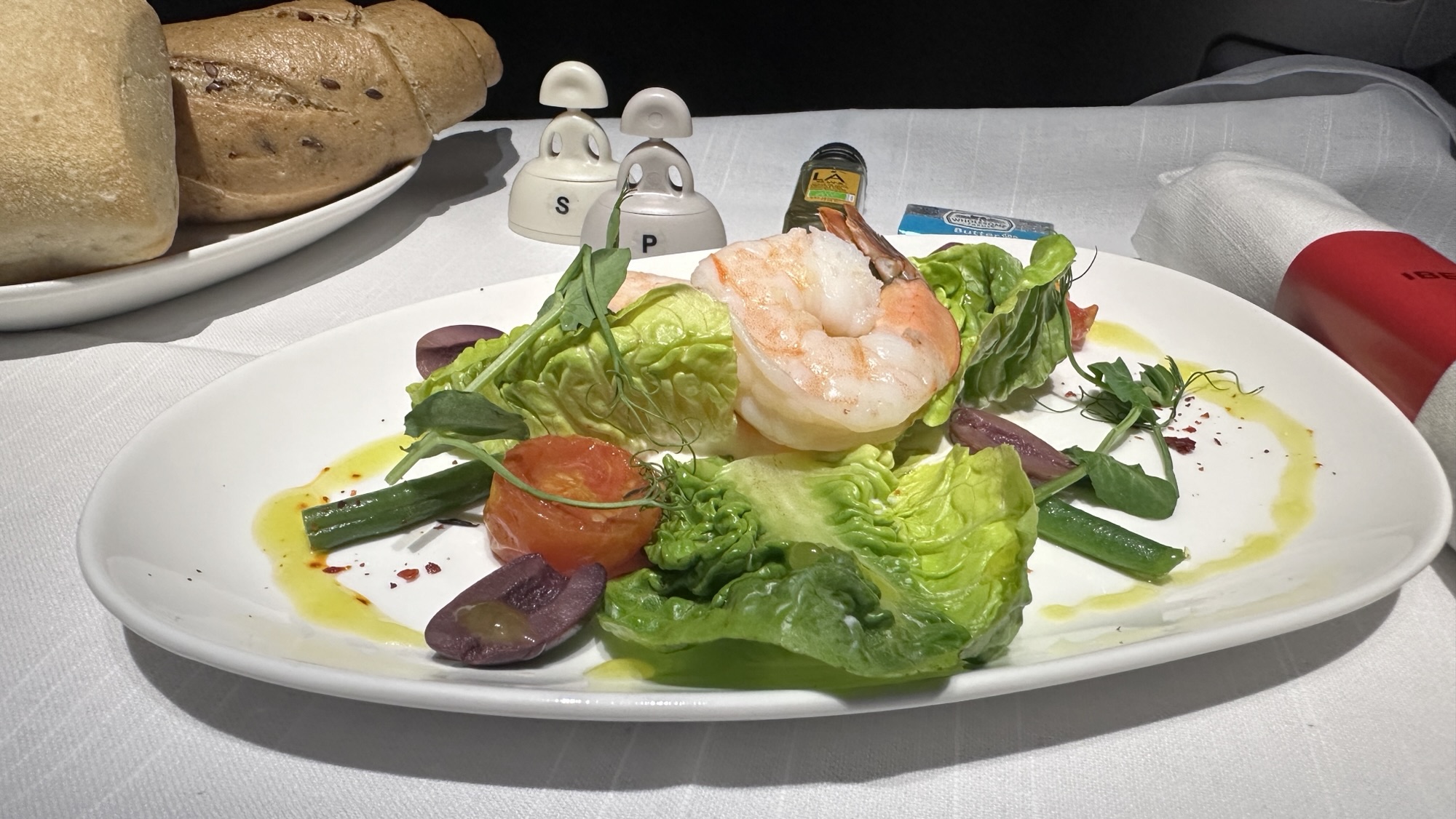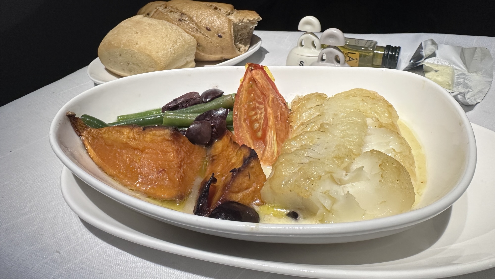 The meal service began shortly after takeoff with a beverage and a selection of appetizers. For the starter, I chose the barley and quinoa salad with roasted beets, which was fresh and light—a perfect way to begin. My companion opted for the niçoise salad, which he found both tasty and satisfying.