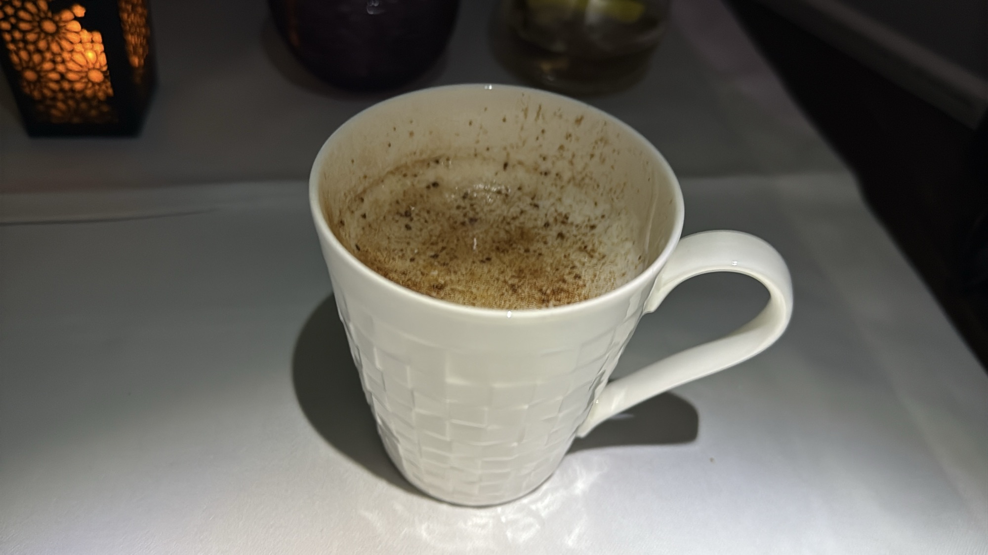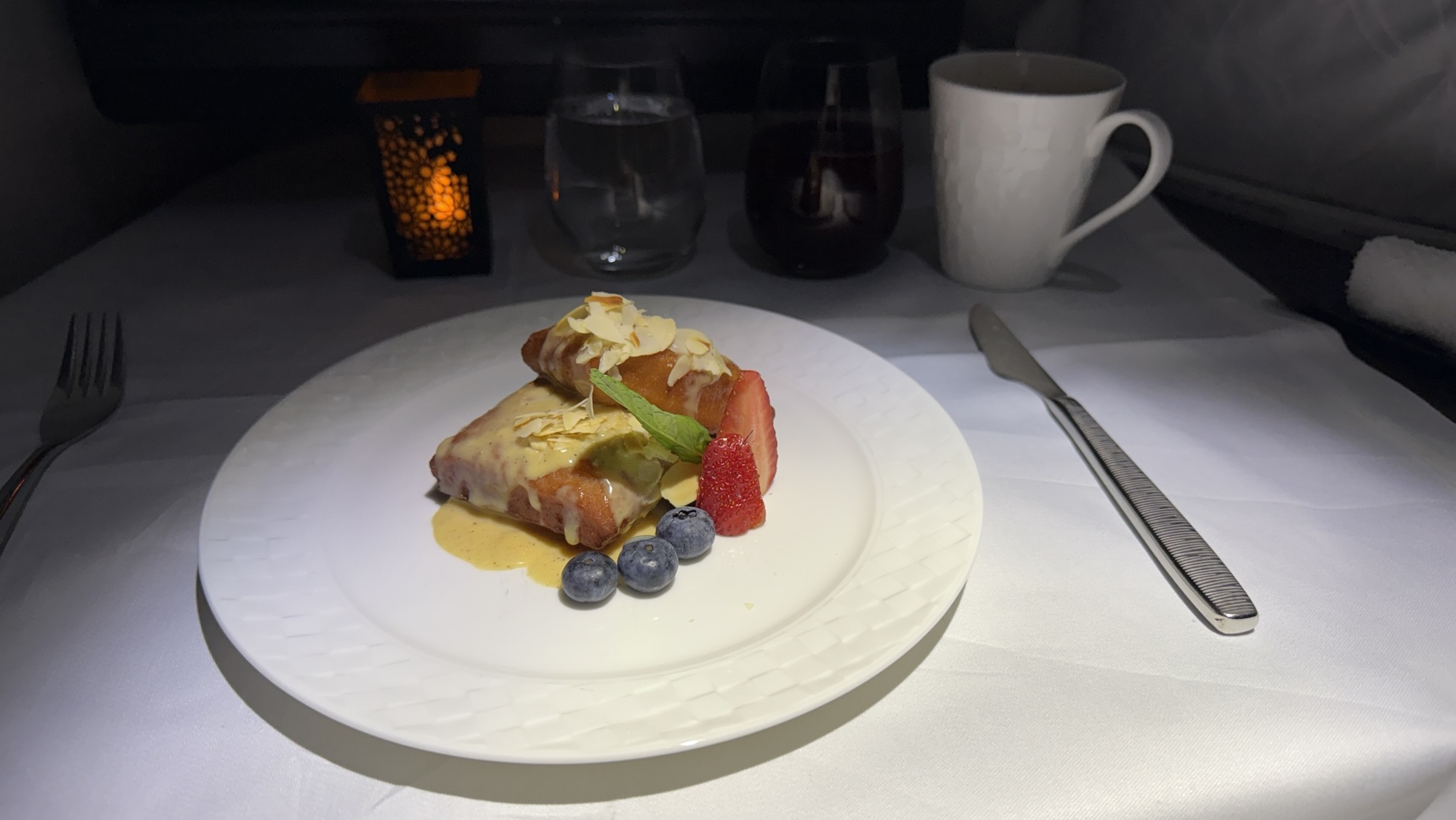 About 90 minutes before landing, I opted for a light breakfast and ordered the Raspberry and Pistachio Beignet with a cappuccino. It was a sweet, satisfying way to end the flight—simple, elegant, and delicious.