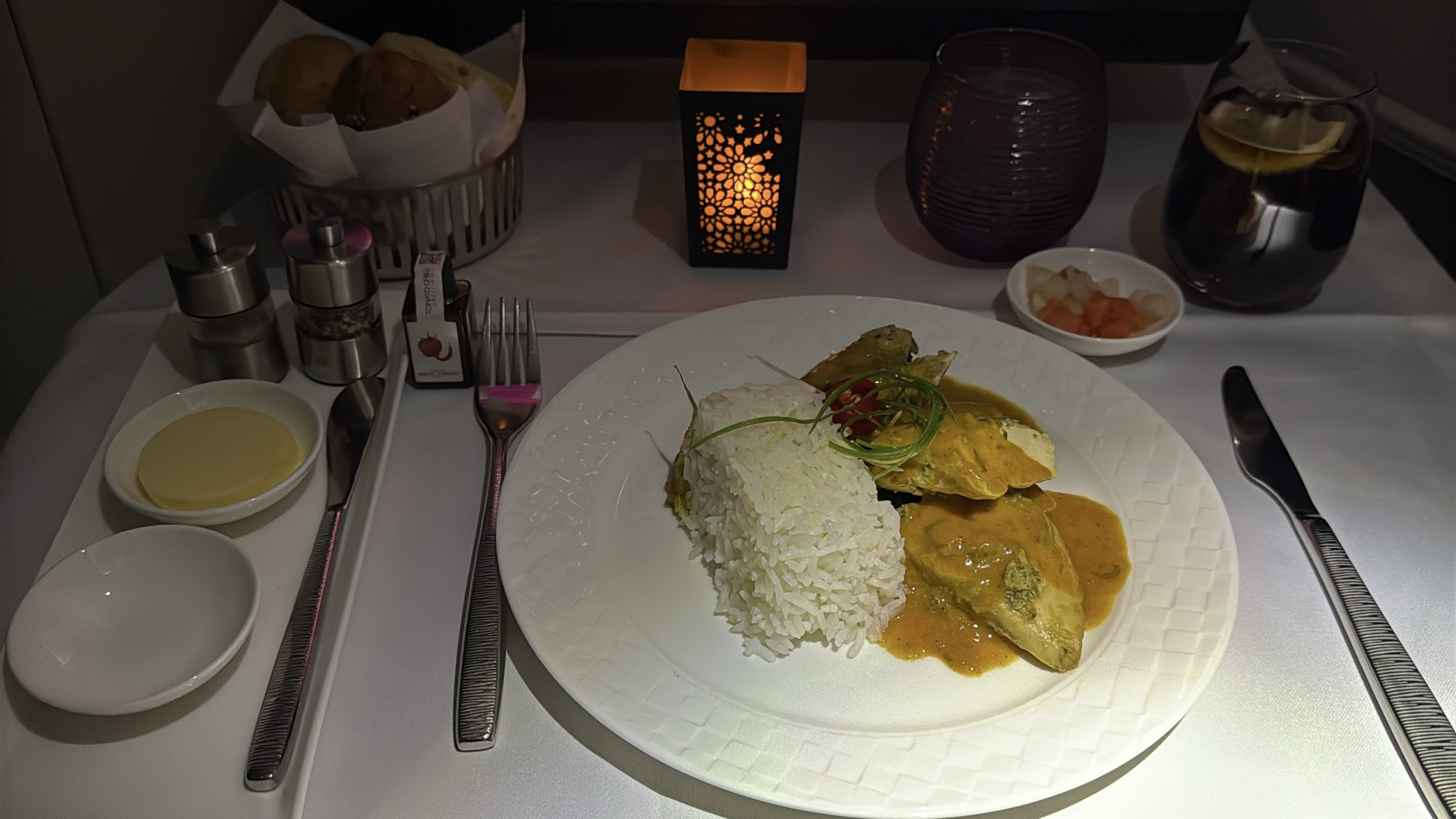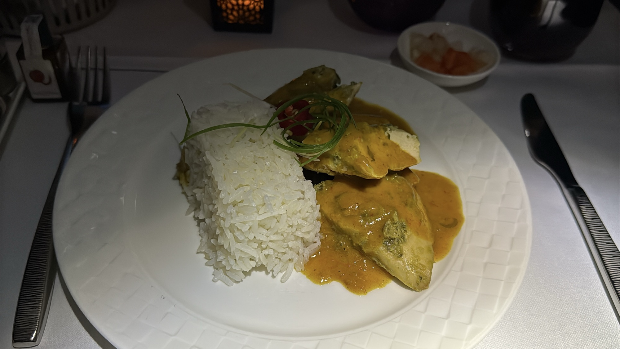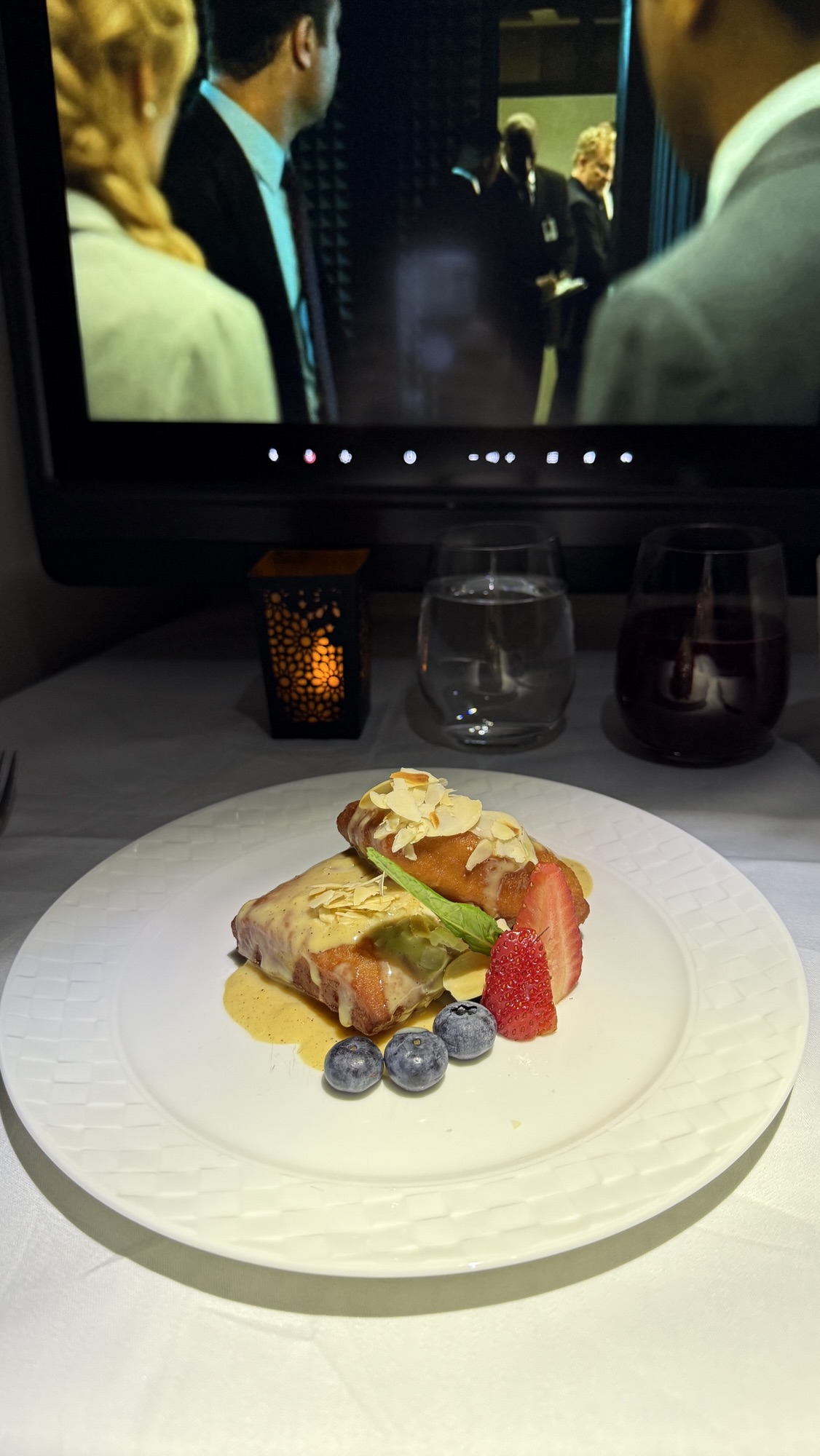 Since this was a late-night departure, the menu was slightly pared down—understandably so, as many passengers would likely prioritize rest. For my meal, I started with some warm artisan bread and chose to skip the appetizer, heading straight for the main course: Thai Yellow Chicken Curry. This is hands down one of my favorite dishes on Qatar. The chicken was tender and juicy, while the curry was flavorful with just the right amount of heat—comforting and satisfying. To wrap up the meal, I went with the Gooseberry Friand served with vanilla ice cream. It was beautifully presented and absolutely delicious—rich, sweet, and a perfect little indulgence.