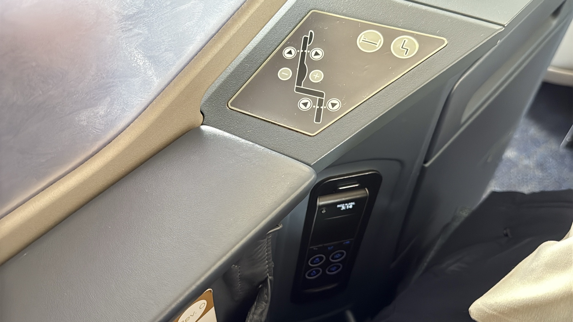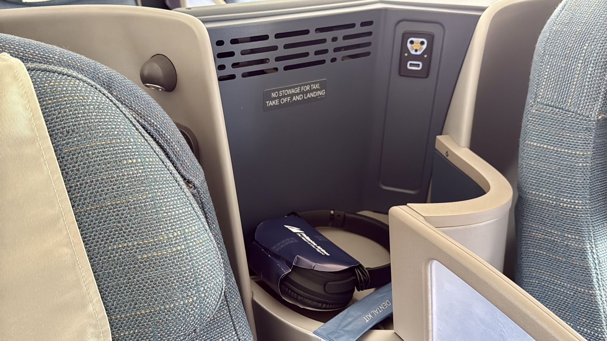 The seat – While these B/E Diamond seats don’t all offer direct aisle access, I found them to be incredibly comfortable. They’re perfect for sitting, lounging, and, when it’s time to rest, lying completely flat. The adjustable armrest is a thoughtful touch that provides a little extra space when fully reclined. Passengers are also provided with noise-canceling headphones, a full-size pillow, and a blanket. It’s worth noting that the cabin was kept at a cool, comfortable temperature, which made it ideal for sleeping.