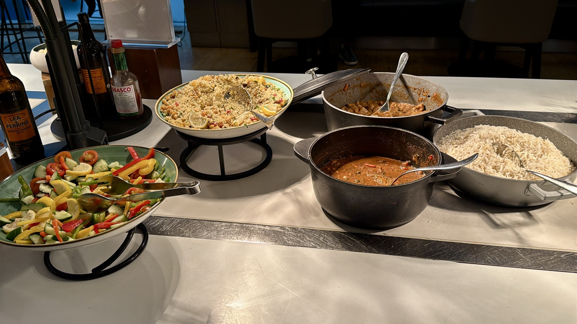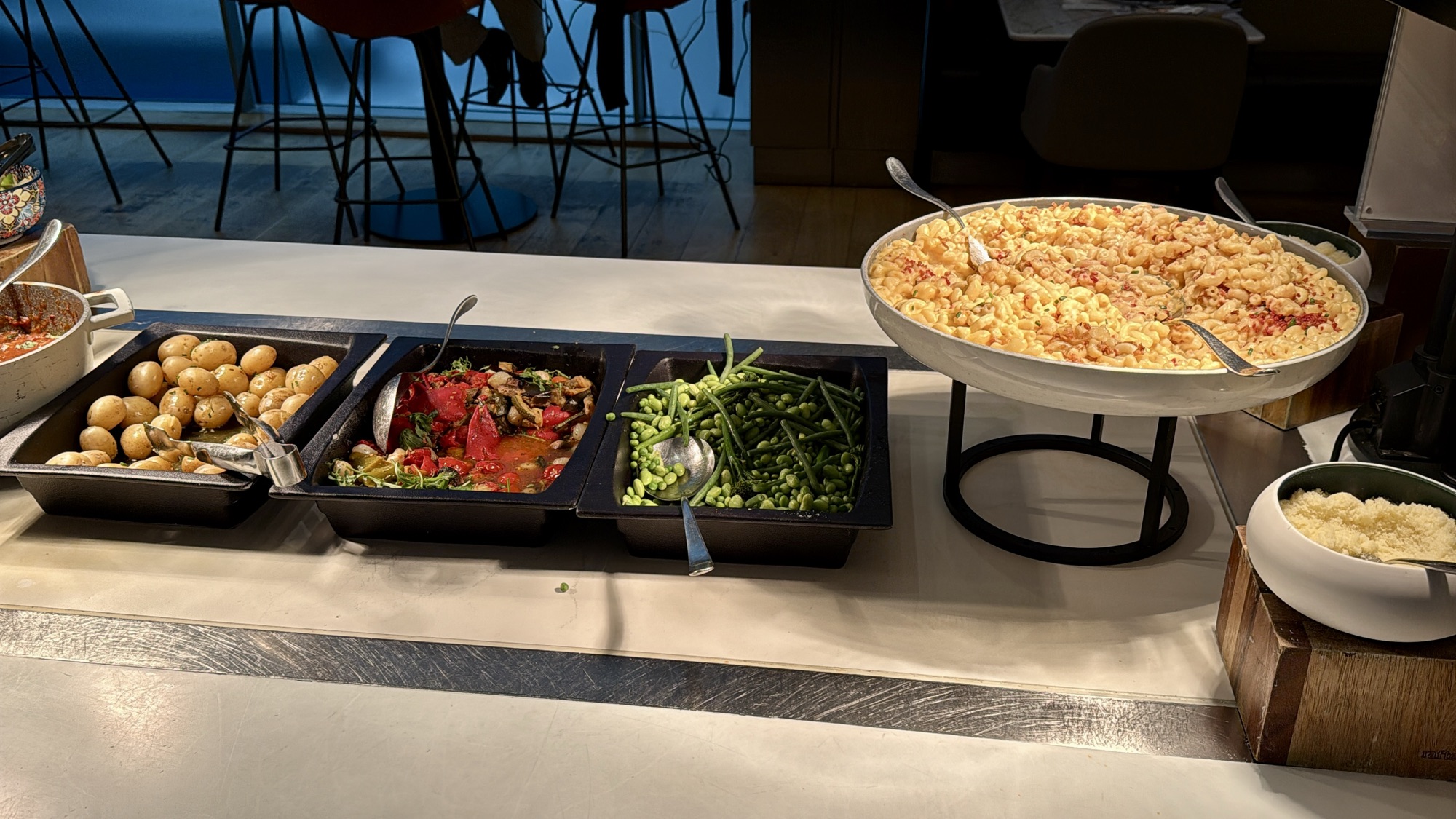 The lounge is bright and spacious, with plenty of seating and large windows overlooking the runway. Food and drink offerings included a hot and cold buffet plus a staffed bar. While the lounge used to offer made-to-order meals via QR code, this feature has been removed. During peak hours, the lounge does get crowded, but it’s still a pleasant space to relax before boarding.
